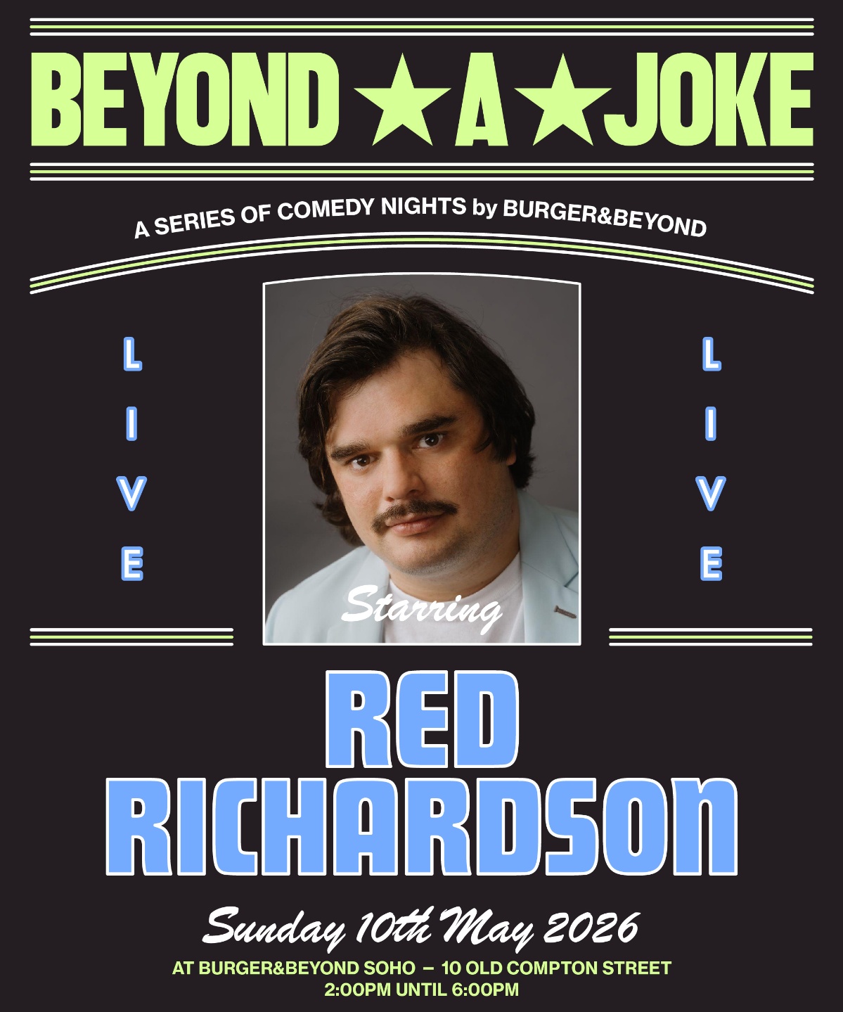 The first edition of our new comedy dining events, Beyond A Joke, is launching on Sunday 10th May at our Soho branch. Joining us on the night is Red Richardson, one of the UK’s most exciting rising voices, known for his work across stand-up, screen, and podcasts.